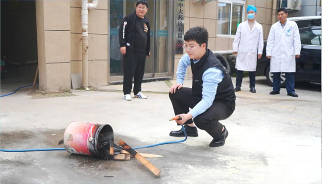 在灭火实操环节,李教员现场讲解了干粉灭火器“一提、二拔、三握、四压”的使用要领。我院医护人员、行政后勤及安保人员依次上前,亲身体验灭火器的操作。通过亲手操作,让大家真正掌握了这项必备的消防技能。
